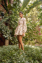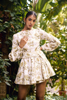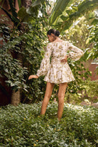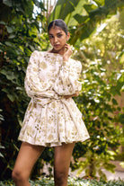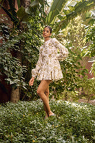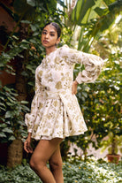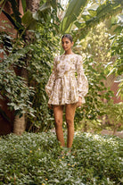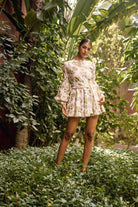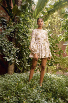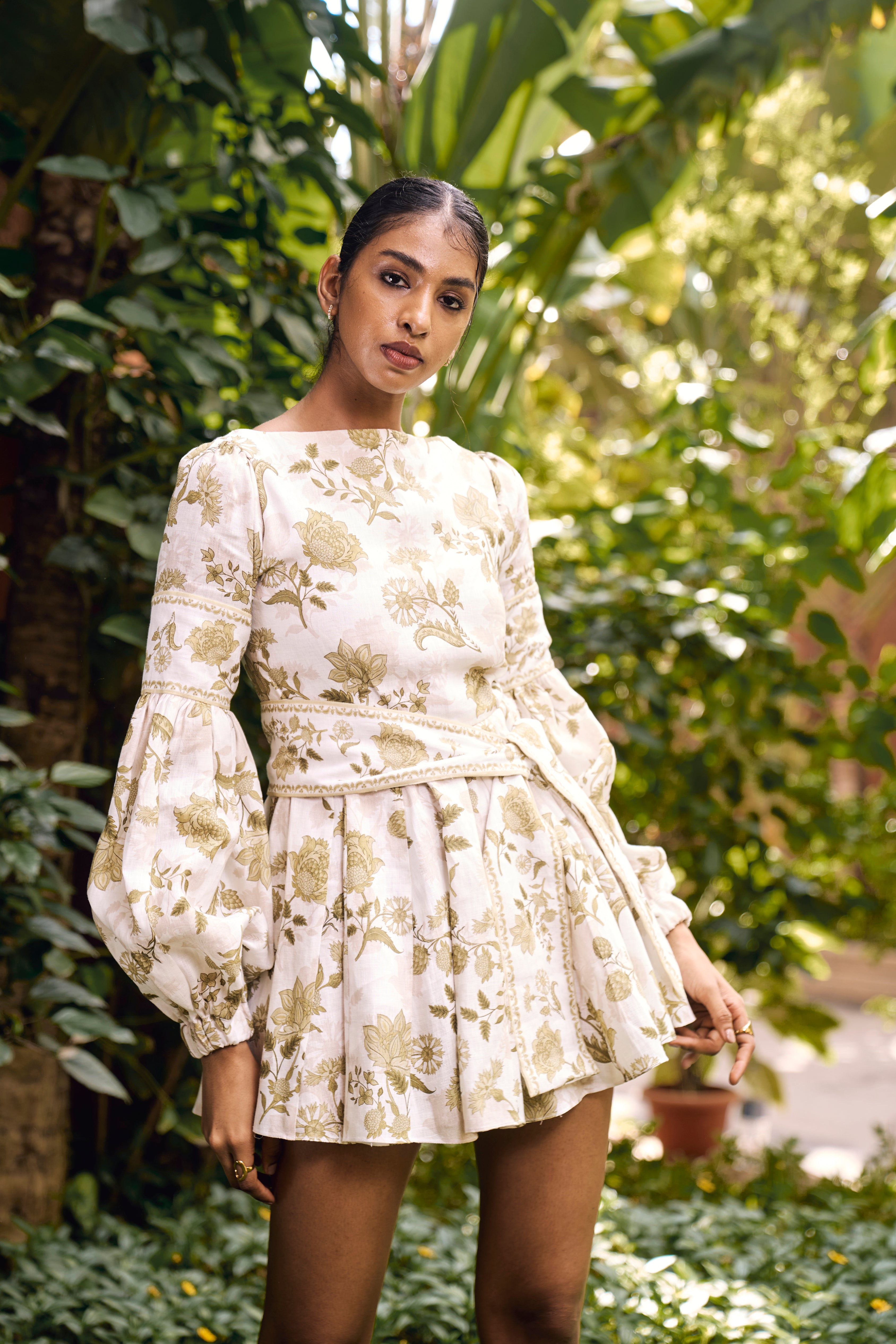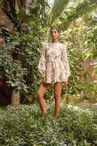 The MARGOT mini dress is made from 100% linen in a vibrant Cornflower emerald print, designed for from daylight to date night. The dress features a wide boat neck and long blouson sleeves with an elasticated cuff. The flared skirt is constructed with different layers joined together, giving it volume. A separate, broad border belt adds detail and cinches the waist. It includes a zip at the back for comfort closure.