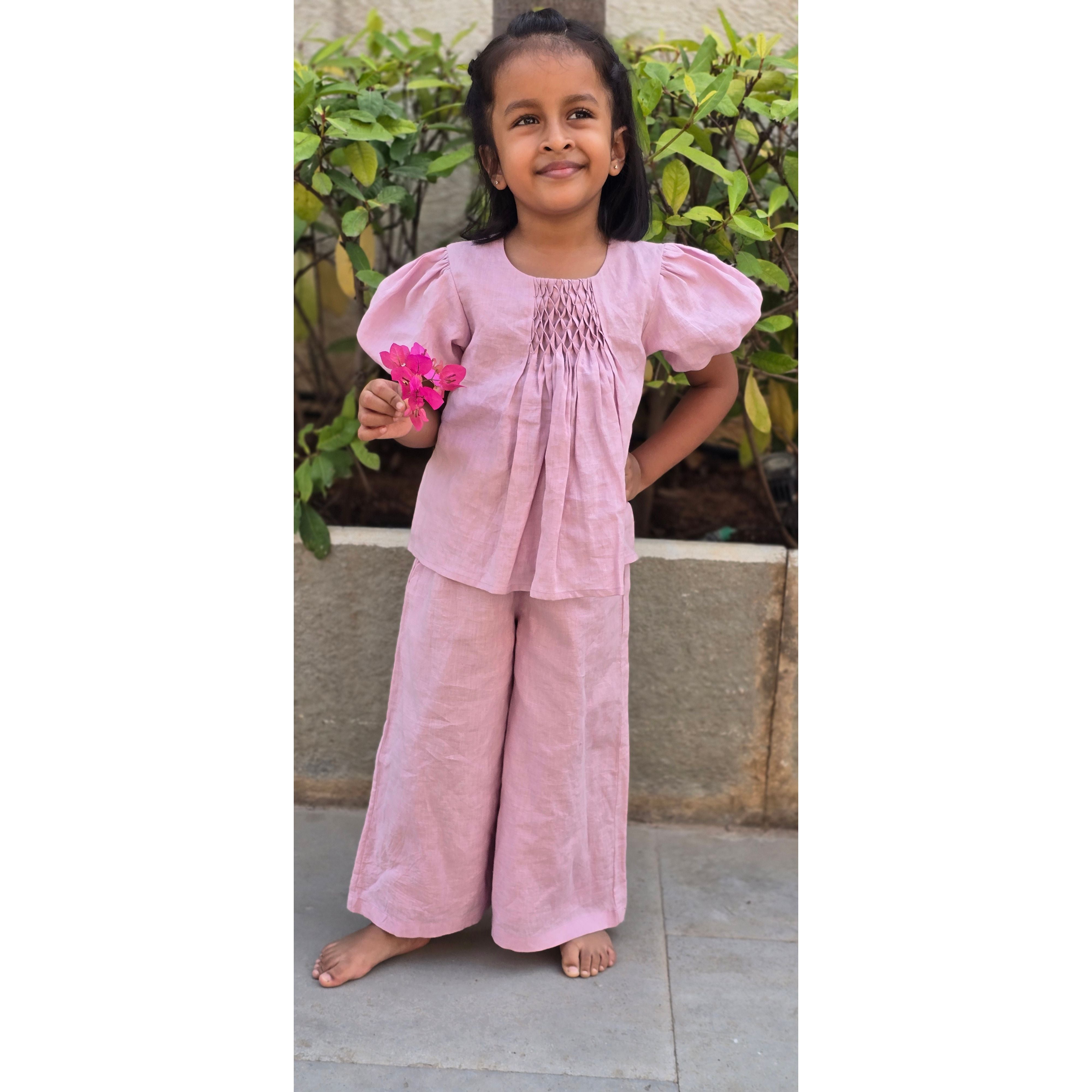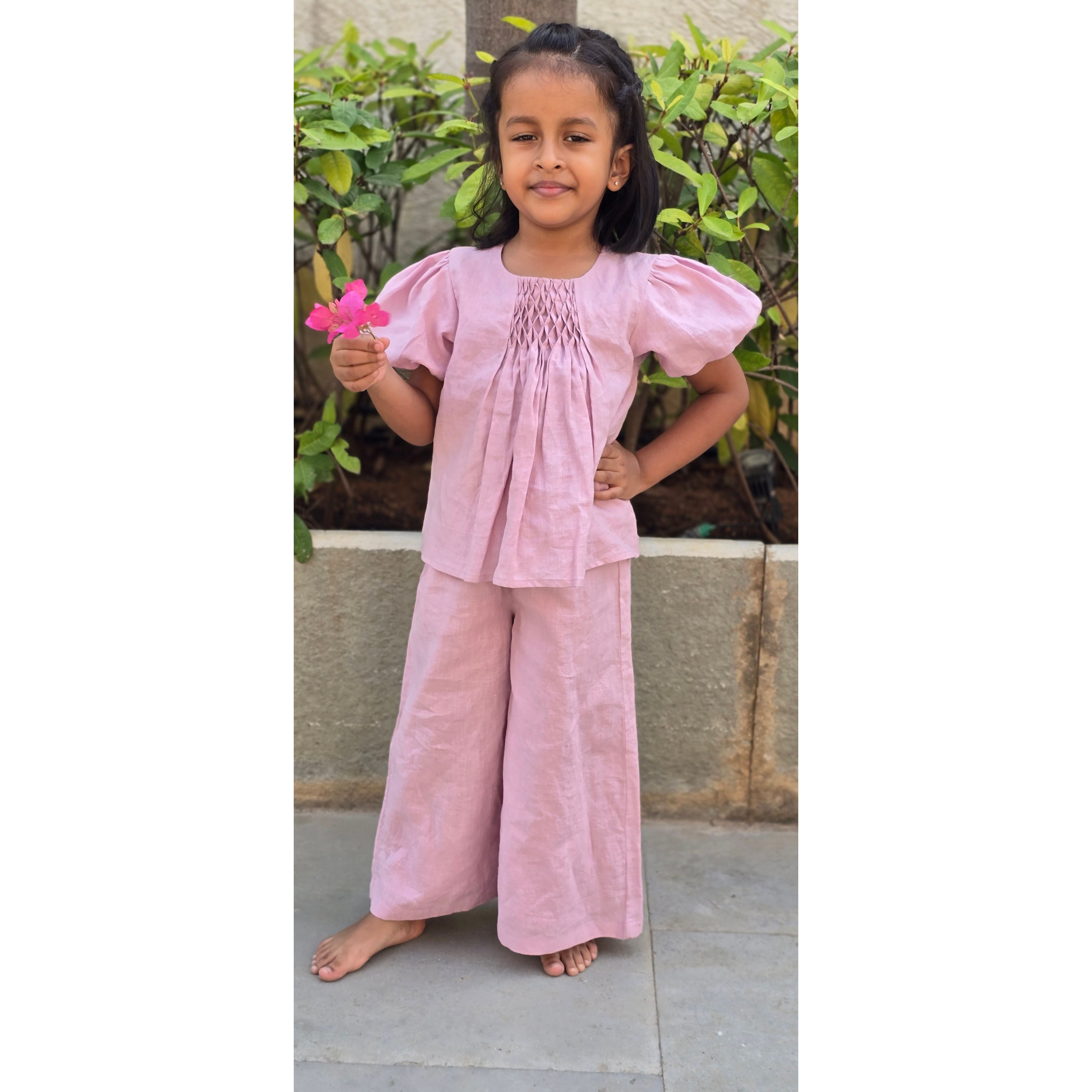 The MERIDA SET made in Soft Premium Linen in PINK color. The blouses with front smoked detail, round neck with keyhole at back one button closure with puffed short sleeve. The Top is fully lined with soft cotton makes it comfortable for kids. The top is paired with flared pant. the elasticated waistband makes it a comfortable fit for all kids. The flared bottom and pockets at waist. The set is best for kids daytime outings.