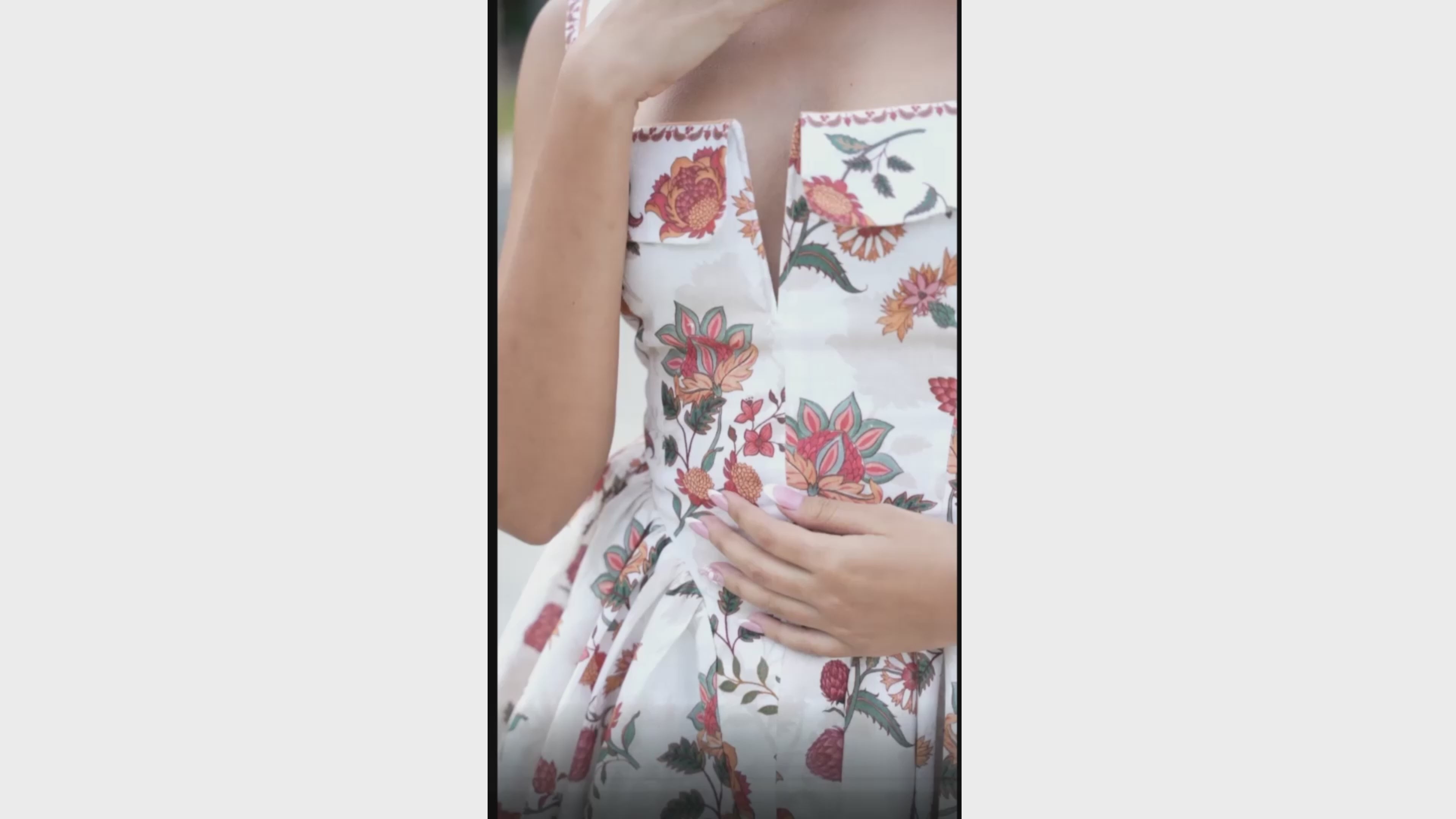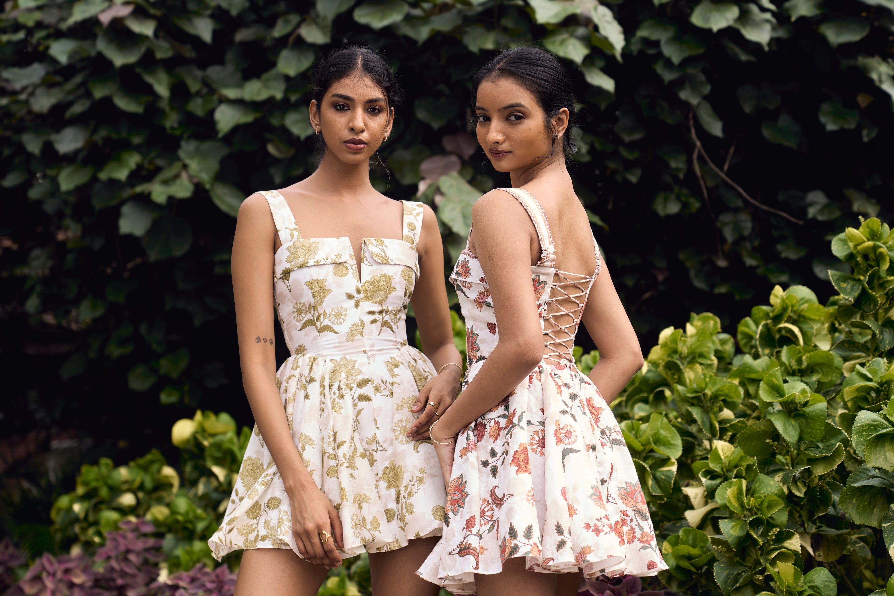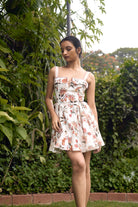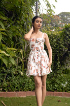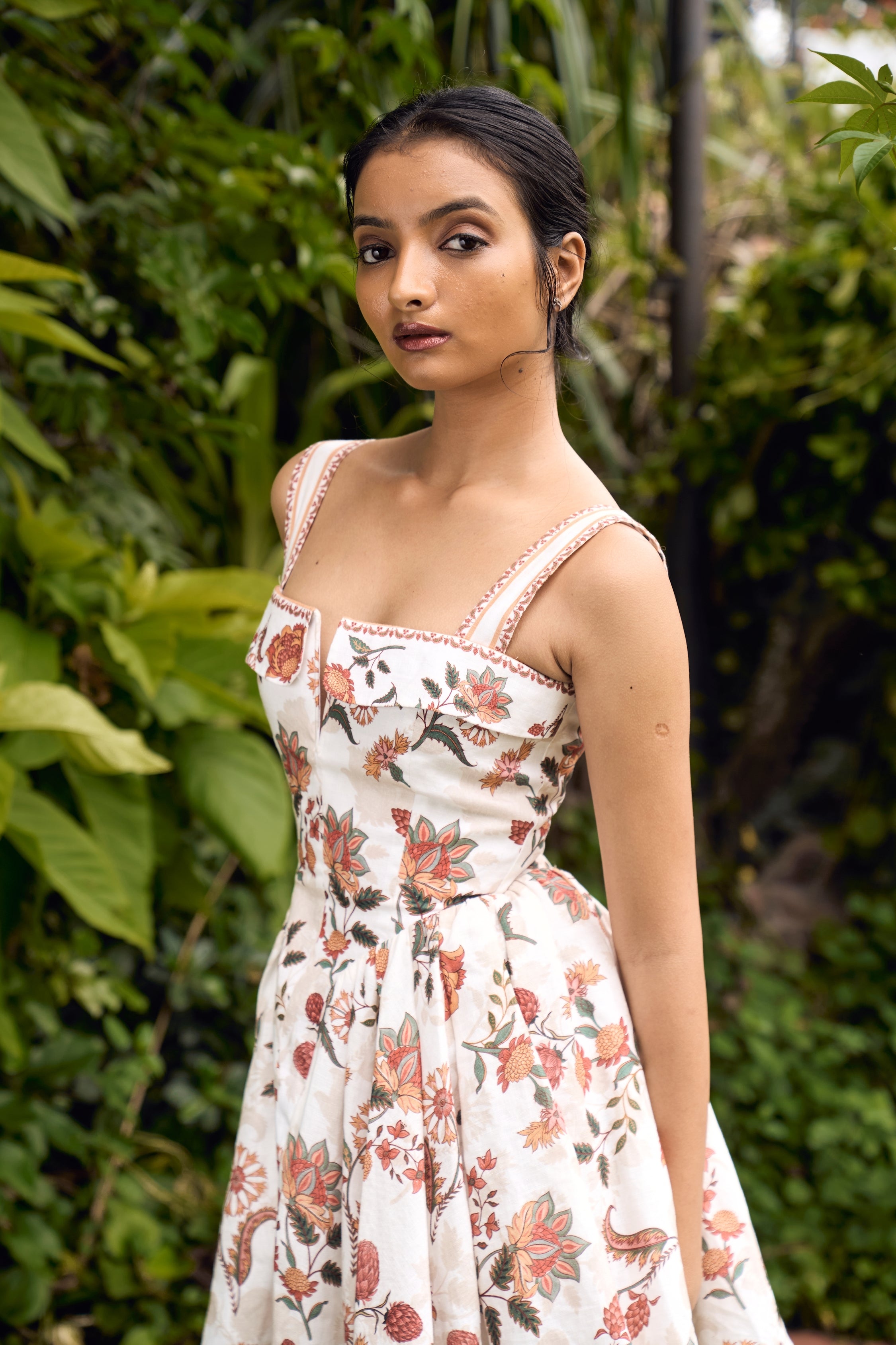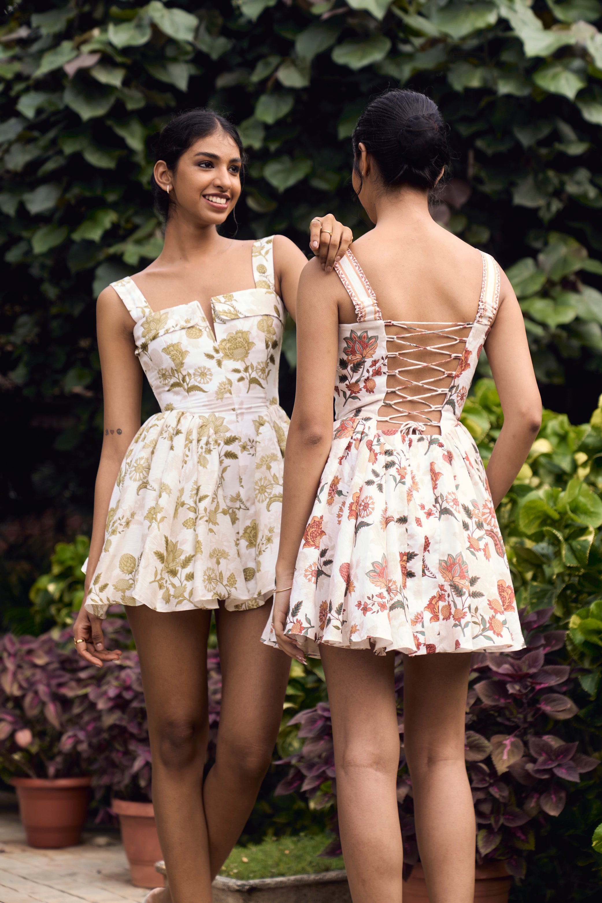 The AALIYAH mini corset dress is meticulously crafted from a luxurious 100% Linen fabric, showcasing a beautiful soft cornflower–multi color print that feels both fresh and timeless.
