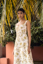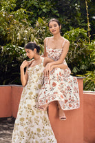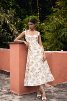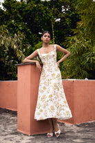The AMELIE Corset Midi Dress is crafted from a luxurious silk-linen (25% Silk, 75% Linen) fabric in a striking Cornflower Emerald Print.