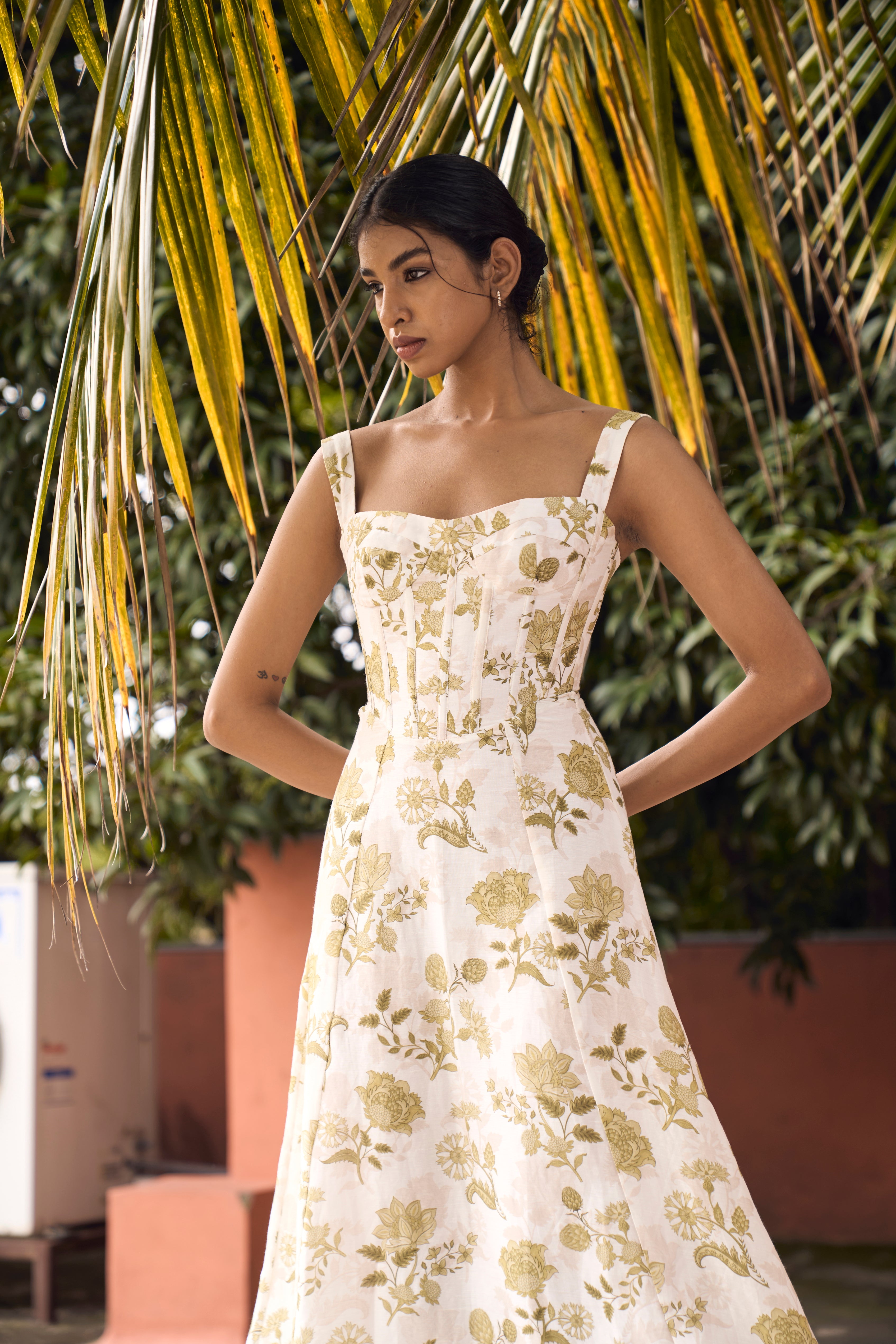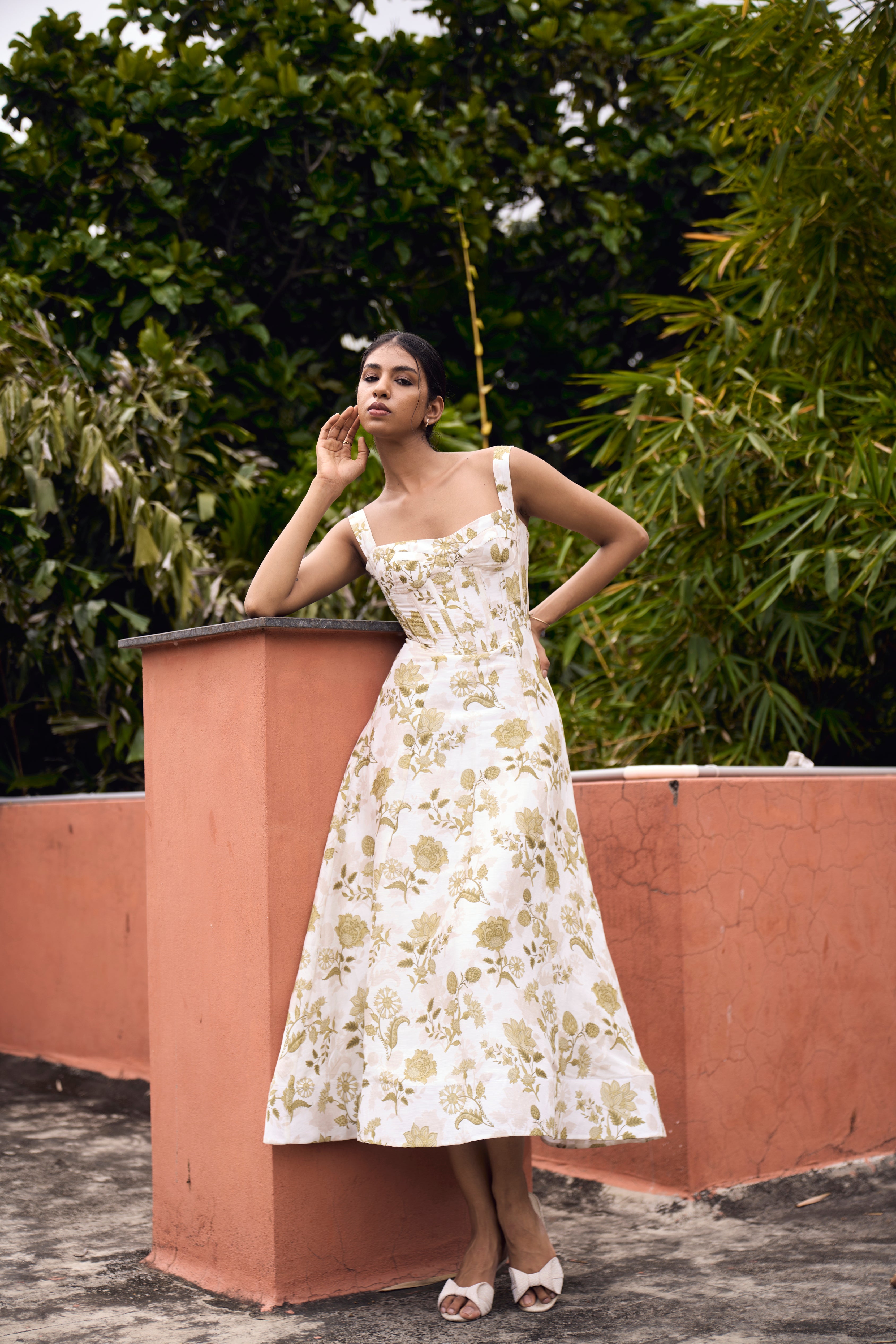 The dress features a structured corset bodice, detailed with boning and delicate straps, which ensures a flattering fit and comfortable wear. The skirt is a flared midi style, composed of fluid panels that add graceful movement. A concealed back zip allows for a seamless closure.