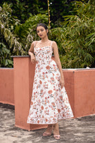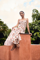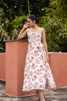 The AMELIE Corset Midi Dress is crafted from 100% Premium Linen in a striking cornflower multi-colored print.