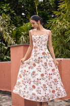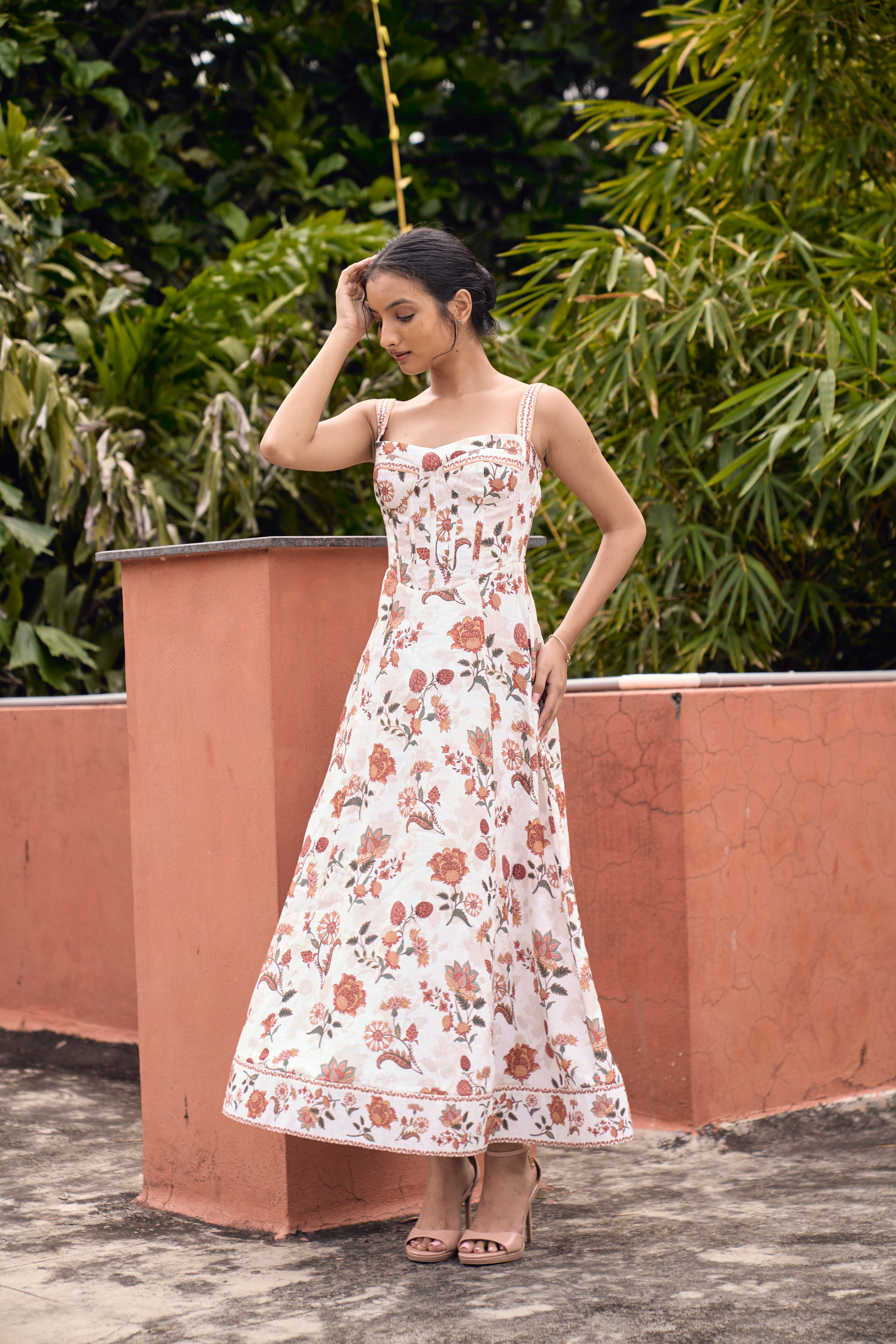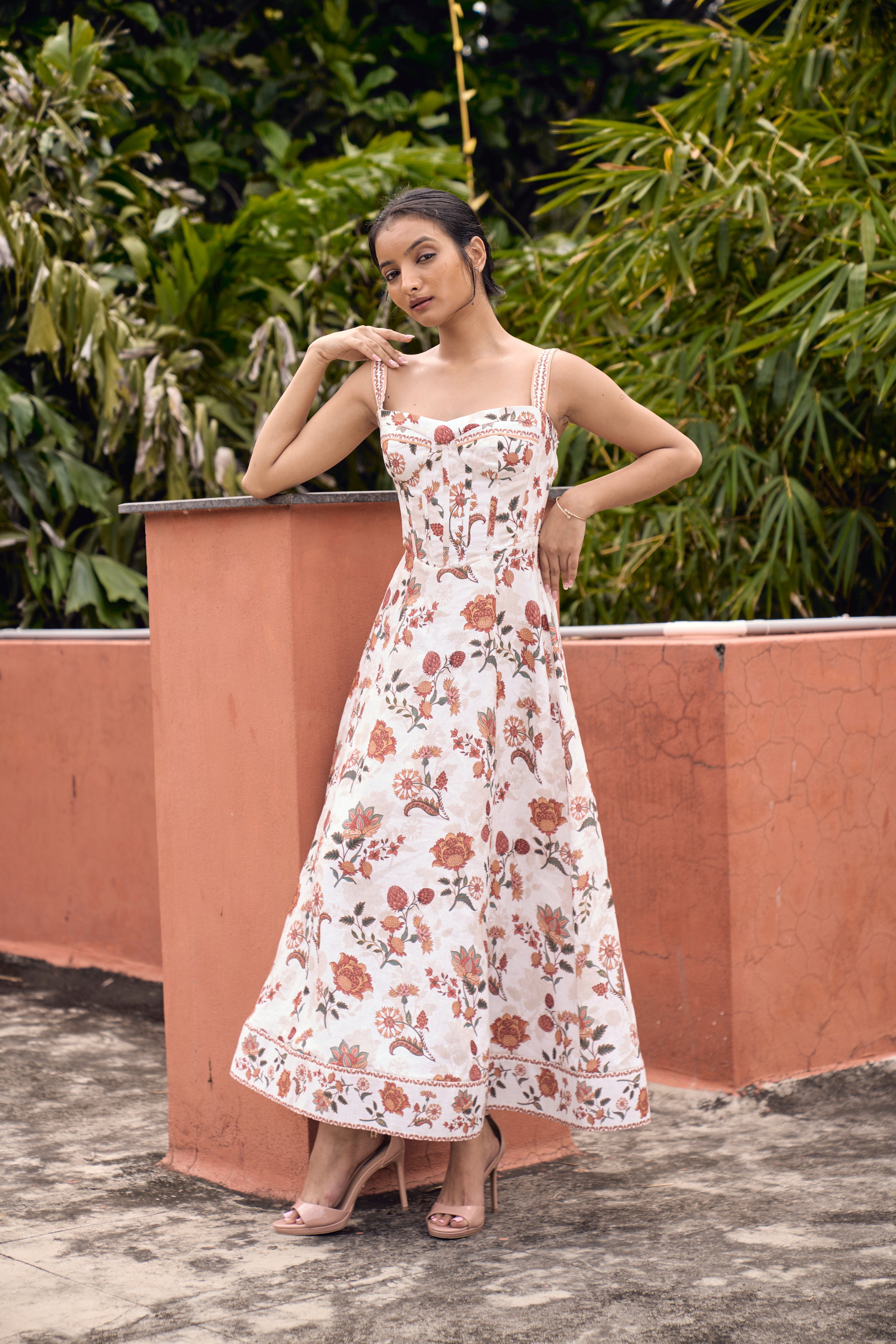 The dress features a structured corset bodice, detailed with boning and delicate straps, which ensures a flattering fit and comfortable wear. The skirt is a flared midi style, composed of fluid panels that add graceful movement. A concealed back zip allows for a seamless closure.