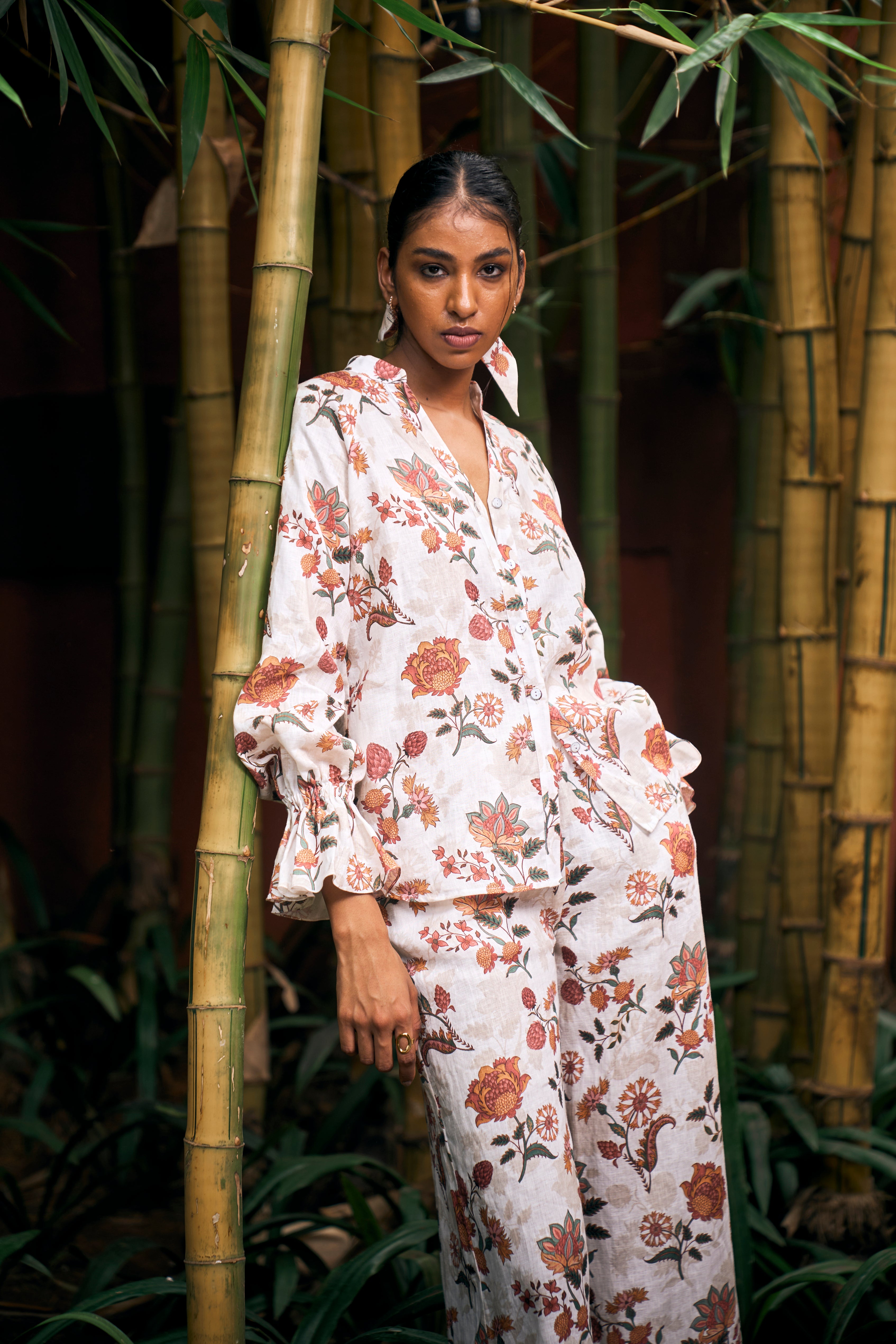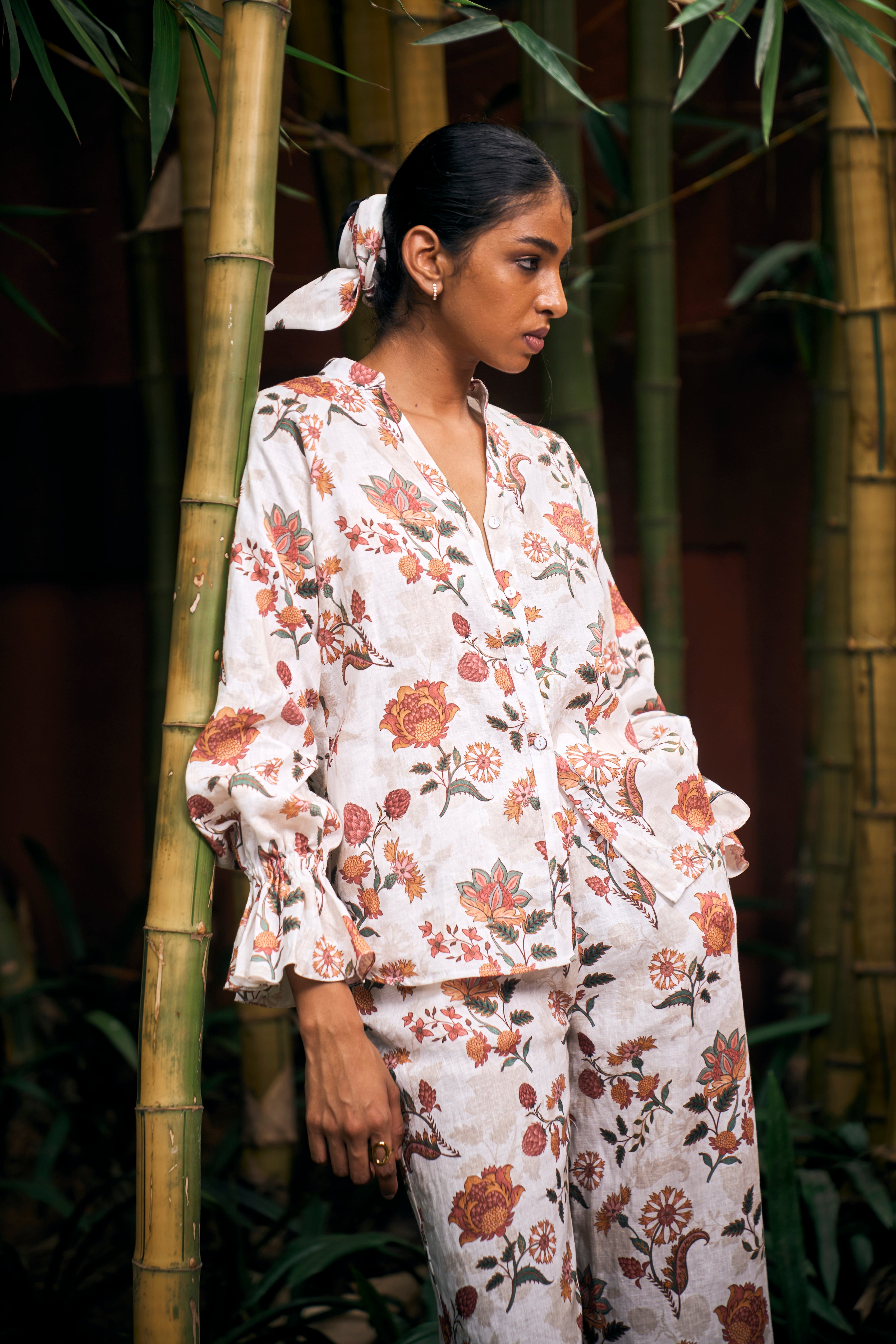 The CELINE Shirt crafted from a 100% Premium Linen showcasing the vibrant cornflower print.The breathable, natural-fiber fabric regular fit shirt with full sleeves and a flattering ruffle cuff detail. Lightweight yet durable, it moves with ease and offers all-day comfort. It can be paired with a matching printed trouser or our wrap skirt or solid linen pants.