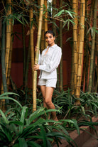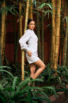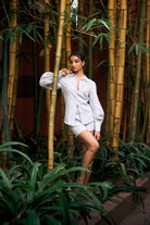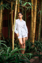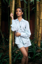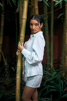 The FIDA SHIRT made in Soft Premium Linen in Delicate Blue color. The regular fit shirt with collar and front full button closure. The long sleeves with gathered puff look with glass cuff & button closure adds it's modern look. Paired with our Lina shorts makes it a perfect casual daytime outfit.